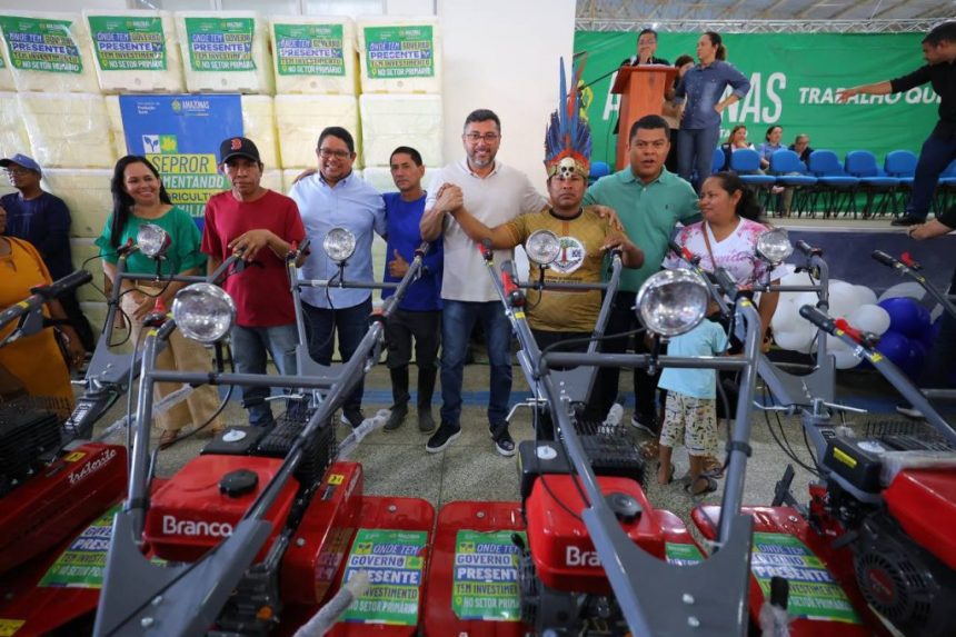 O governador também coordenou entregas voltadas à produção rural e fortalecimento da agricultura familiar. Foram entregues equipamentos como motocultivadores, mangueiras, motores, freezeres, kits roçado, mudas e cheques do Crédito Feirante.