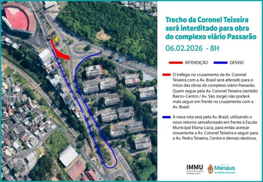 A Prefeitura de Manaus, por meio do Instituto Municipal de mobilidade urbana (IMMU), informou que, a partir desta sexta-feira, 6/2, às 8h, o tráfego no cruzamento da avenida Coronel Teixeira com a avenida Brasil sofrerá mudanças para a realização das obras do complexo viário Passarão. A interdição altera o acesso direto de motoristas que seguem do bairro em direção ao Centro.