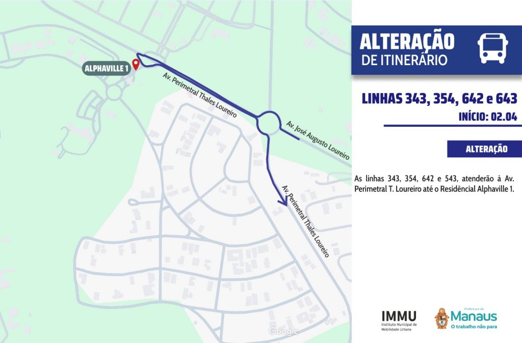 A Prefeitura de Manaus, por meio do Instituto Municipal de mobilidade urbana (IMMU), informa que, a partir de quinta-feira, 2/4, haverá alteração no itinerário das linhas de ônibus 343, 354, 642 e 643, na zona Norte da capital.